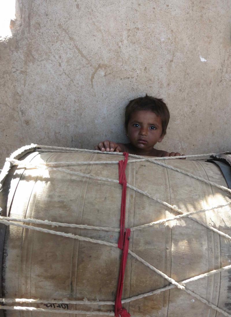 A young member of the rising generation rests on a wooden Merasi Dhol dating more than 250 years